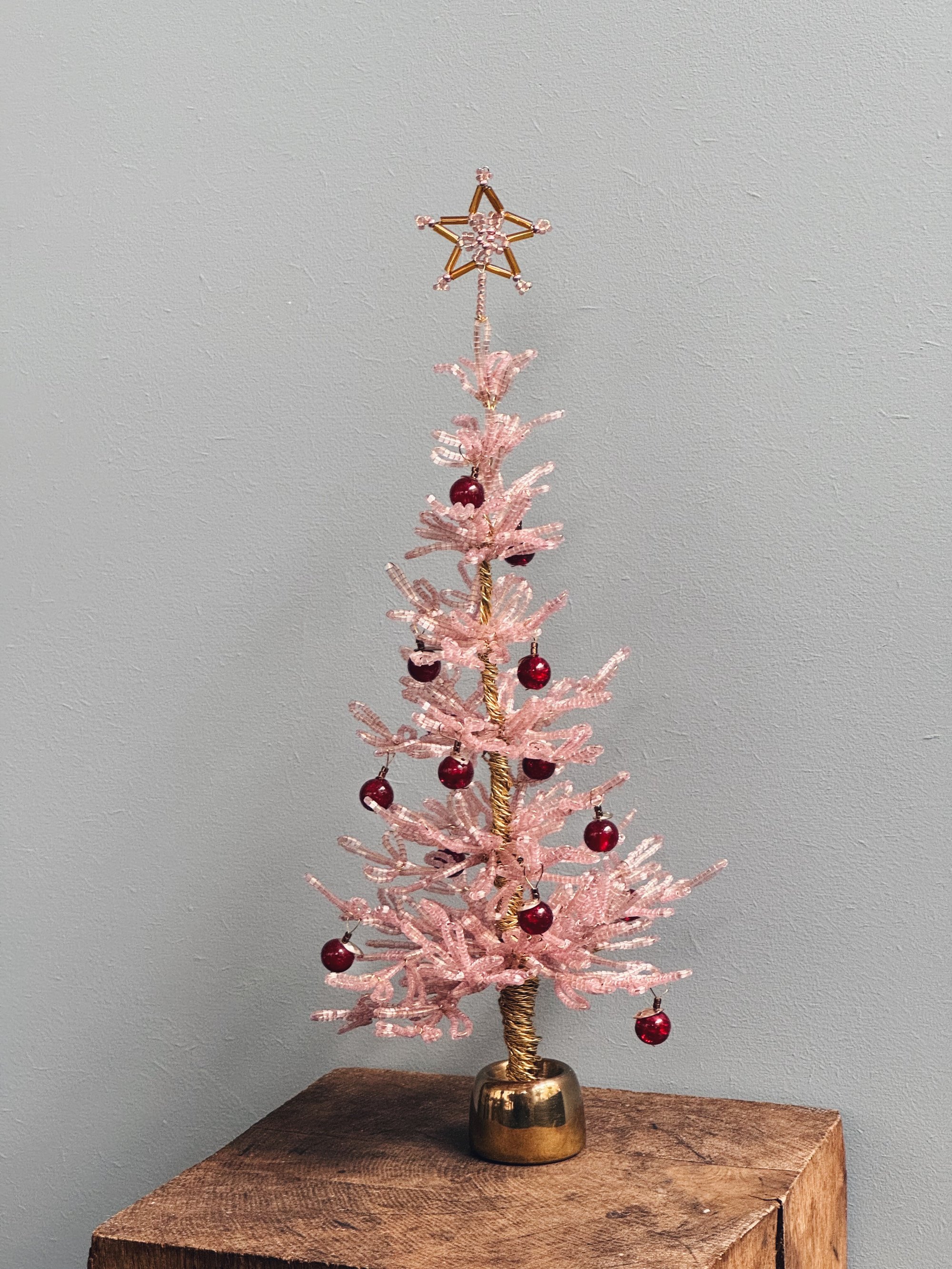 Perlejuletræ af Camilla Tange, Jeg går ikke på kompromis med mine træer, men lægger massere af kærlighed i hvert træ. De tager mig 2 dage at lave. vikler perlerne til grangrene, samler træet, montere det på fod, laver mini julepynten og pynter træet. . De har alle hver deres særpræg farver og detaljer. Små svampe, hvor prikkerne er håndmalet, eller guirlander i forskellige udtryk, stjerner, æbler eller små snemænd mv.