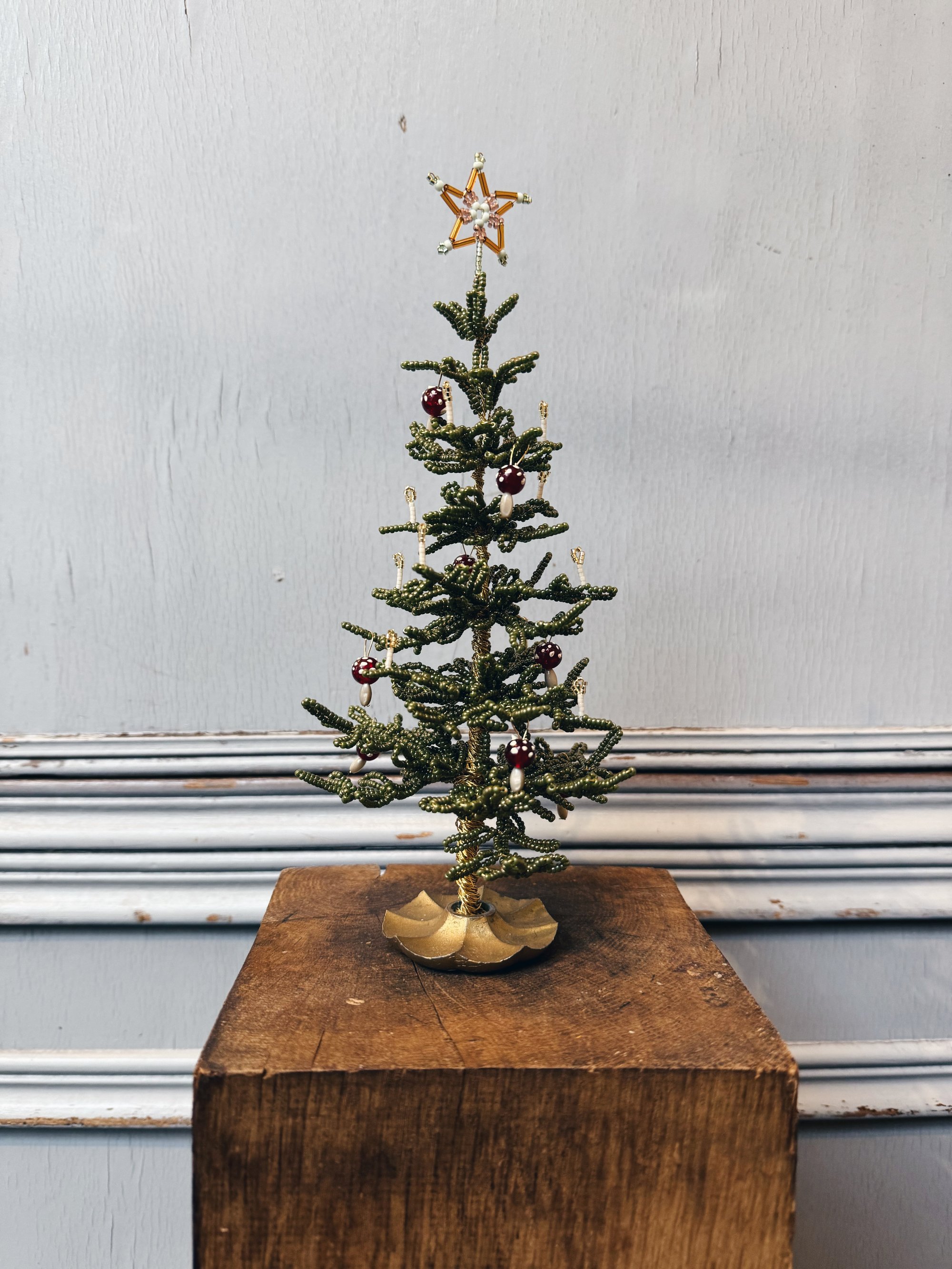 Perlejuletræ af Camilla Tange, Jeg går ikke på kompromis med mine træer, men lægger massere af kærlighed i hvert træ. De tager mig 2 dage at lave. vikler perlerne til grangrene, samler træet, montere det på fod, laver mini julepynten og pynter træet. . De har alle hver deres særpræg farver og detaljer. Små svampe, hvor prikkerne er håndmalet, eller guirlander i forskellige udtryk, stjerner, æbler eller små snemænd mv.