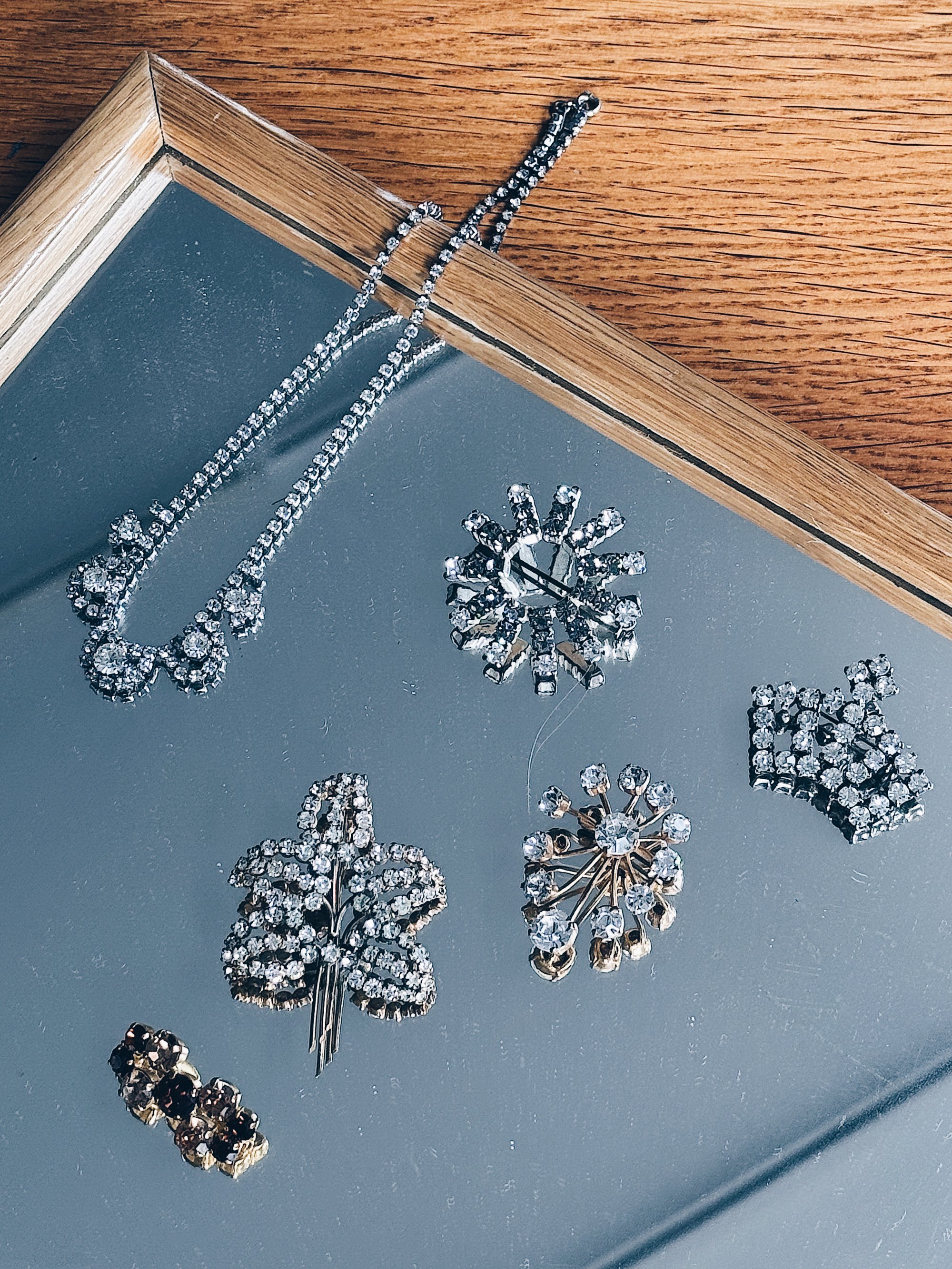 Finest delikate broche fra 30-40’erne i spejlglas. Så smuk vintage detalje der kan sætte prikken over et hvert sæt tøj.